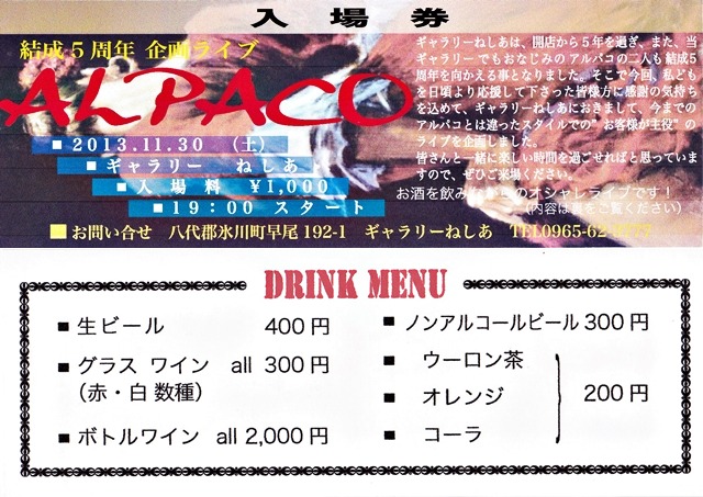 ALPACO結成5周年記念ライヴ日時:11月30日(土)、開場18:30、開演19:00場所:ギャラリーねしあ出演:ALPACO入場料:¥1000住所:〒869-4606 熊本県八代郡氷川町早尾192-1電話:0965-62-3777